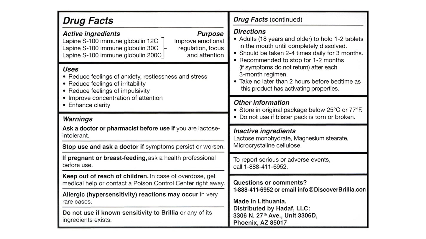 Brillia for Adults is a non-prescription/over the counter medication to reduce anxiety and symptoms of ADHD, such as, irritability, hyperactivity and lack of focus in adults. Our clinically proven formulation helps control symptoms without any harmful side effects or contraindications. For best results, use Brillia daily for a 3 month period. No flavor, easy-dissolve tablets.