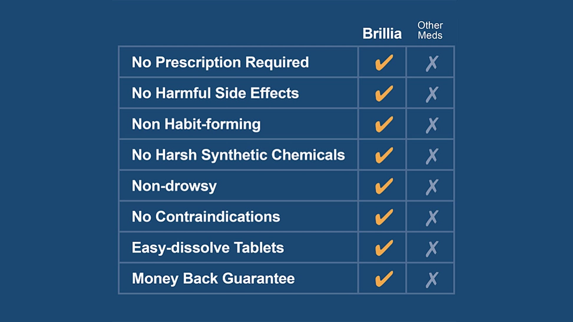 Brillia is a non-prescription/over the counter medication to reduce anxiety and symptoms of ADHD, such as, irritability, hyperactivity and lack of focus in children and teens. Our clinically proven formulation helps control symptoms without any harmful side effects or contraindications. For best results, use Brillia daily for a 3 month period. No flavor, easy-dissolve tablets.